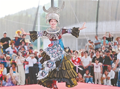 7月31日,廣西壯族自治區(qū)柳州市融水苗族自治縣大年鄉(xiāng)舉辦了“最美姑娘”評選活動,20名選手身著民族服飾,以文藝表演、T臺走秀等形式展示苗鄉(xiāng)侗寨各族風(fēng)采。圖為評選現(xiàn)場。蘭堃 攝