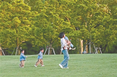 家長帶著小朋友在上海世紀公園草地上玩耍。 朱偉輝 攝