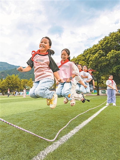 近年來(lái),貴州省黔東南苗族侗族自治州從江縣各中小學(xué)積極打造“歡樂課間”的校園文化,鼓勵(lì)學(xué)生在課間走出教室,參加各種體育活動(dòng)和趣味游戲,讓學(xué)生們?cè)谙硎芸鞓氛n間的同時(shí)強(qiáng)身健體,健康成長(zhǎng)。圖為9月10日,剛邊壯族鄉(xiāng)中心小學(xué)學(xué)生在課間跳繩。羅京來(lái) 攝