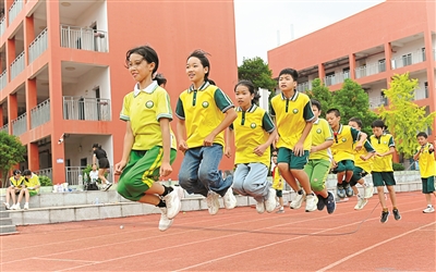 9月18日,在湖南省邵陽市洞口縣花古街道芙蓉學校的運動場上,學生們正活力滿滿地跳繩。近年來,洞口縣中小學校引導學生們利用大課間、體育課等時間開展跳繩、球類、趣味游戲等特色文體活動,讓學生在運動中愉悅身心、增強體質(zhì)。滕治中 攝
