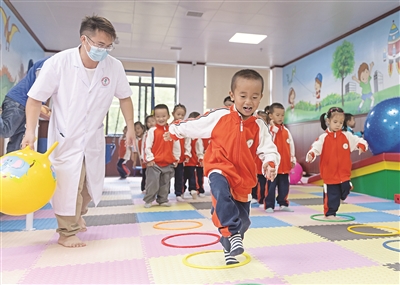 9月25日,貴州省黔東南苗族侗族自治州施秉縣第四幼兒園開展“體驗中醫(yī)文化 感受中醫(yī)魅力”課外實踐活動,組織學(xué)生走進施秉縣民族中醫(yī)院學(xué)習(xí)中醫(yī)藥知識,沉浸式體驗中醫(yī)文化的獨特魅力。圖為學(xué)生在中醫(yī)院兒童康復(fù)科體驗感統(tǒng)訓(xùn)練。磨桂賓 攝