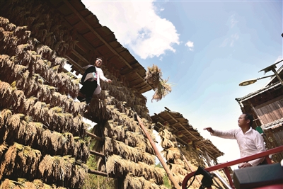 金秋時(shí)節(jié),貴州省黔東南苗族侗族自治州從江縣高增鄉(xiāng)占里村,侗族同胞將豐收的糯禾晾曬在禾晾架上,呈現(xiàn)出一幅豐收曬秋圖。圖為10月12日,占里村村民在晾曬糯禾。