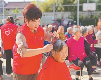 “說事大院”文明實踐平臺志愿者為老年人理發(fā)。(城固縣委宣傳部供圖)