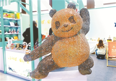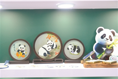 熊貓文創(chuàng)集市上,融合熊貓?jiān)氐那祭C作品。