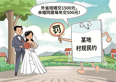 如今,一個沒有立法權(quán)和執(zhí)法權(quán)的村民小組,卻推出含有“外省結(jié)婚交1500元”等內(nèi)容的村規(guī)民約,這是對婚姻自由的干涉。此外,“從結(jié)婚到生小孩不足月,罰款3000元”“夫妻吵架干部來處理罰500元/人”“未婚住在一起500元/年”等規(guī)定,更是無稽之談。比如“未婚先孕罰款3000元”,未婚先孕行為雖然未必妥當,但遠未上升到違法的嚴重程度,縱觀相關(guān)法律,也沒有對未婚先孕進行處罰的規(guī)定,且為了保障嬰幼兒合法權(quán)益,即便是婚外生育等情形,也應(yīng)按照規(guī)定為其辦理戶籍登記,依法提供社保等保障。而“未婚住在一起”同樣只是不受《中華人民共和國民法典》保護的行為,但不屬于違法行為。