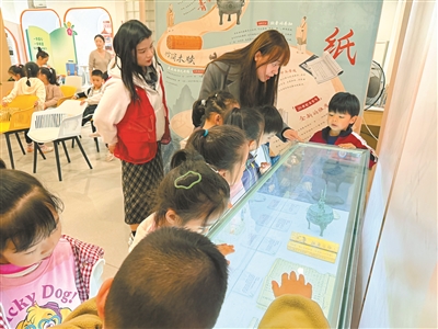 在浙江寧波潘火街道殷家社區(qū)“一平米博物館”,志愿者為轄區(qū)小朋友講解書籍演變歷程。(寧波市鄞州區(qū)文明辦供圖)