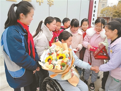 近日,“湖北省自強模范”、輪椅競速運動員張園走進湖北省竹山縣寶豐鎮(zhèn)寶豐中學,開展題為“自強不息·筑夢青春”的事跡報告會,向2000余名師生分享了她十余年的奮斗歷程。圖為張園和孩子們互動。