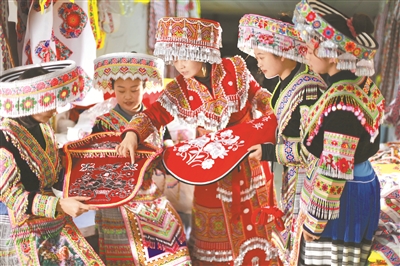 連日來(lái),貴州省黔西市鐵石苗族彝族鄉(xiāng)工會(huì)為外來(lái)務(wù)工人員和返鄉(xiāng)大學(xué)生開展刺繡技能培訓(xùn),拓展就業(yè)渠道,助力當(dāng)?shù)厝罕娋蜆I(yè)。圖為1月26日,黔西市鐵石苗族彝族鄉(xiāng)繡花車間,該市苗繡技藝傳承人陳敏(中)講解苗族服飾的花樣和分類。周訓(xùn)超 攝