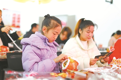 1月25日,在重慶高新區(qū)虎溪街道學(xué)成社區(qū),小朋友與家長齊聚一堂,共同參與“手作吉祥獅 傳承中國年”手工活動(dòng)?;顒?dòng)現(xiàn)場,志愿者和社區(qū)工作人員生動(dòng)講解春節(jié)來歷與傳統(tǒng)習(xí)俗。圖為小朋友和家長一起做吉祥獅。孫凱芳 攝