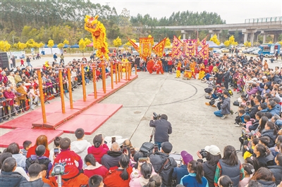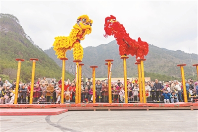 2月7日,在廣西梧州市蒙山縣天書俠谷景區(qū),來自藤縣禤洲的舞獅隊(duì)表演國家級(jí)非物質(zhì)文化遺產(chǎn)高樁獅舞,用一套高難度、驚險(xiǎn)刺激的動(dòng)作為群眾奉上視覺盛宴。黃勝林 攝