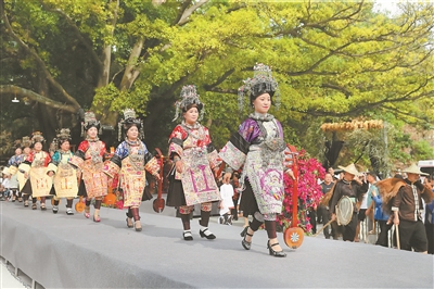 在貴州省黔東南苗族侗族自治州榕江縣忠誠鎮(zhèn)樂鄉(xiāng)村,村民身著民族盛裝參加“村T”走秀。李長華 攝