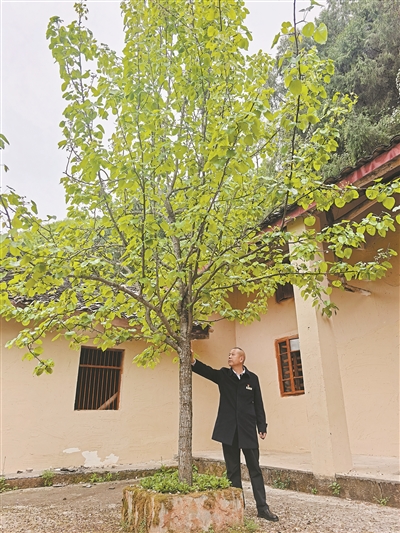 黃擁軍在老屋院中的梨樹下。羅園 攝