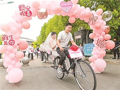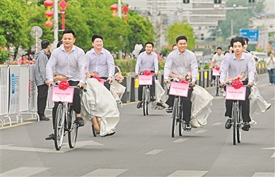新人騎“二八大杠”自行車參加集體婚禮。(受訪者供圖)