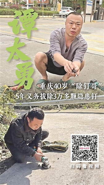 近日,一位網(wǎng)名叫“小勇哥”的男子在網(wǎng)絡(luò)上走紅。他叫譚太勇,一位來自重慶市石柱土家族自治縣沿溪鎮(zhèn)陡巖村的普通務(wù)工者。他在過去的五年里,利用業(yè)余時間,在重慶、貴州、廣東、福建等地的城鄉(xiāng)道路上,義務(wù)清除了3萬多顆可能傷人的地釘,被大家親切地稱為“除釘哥”。